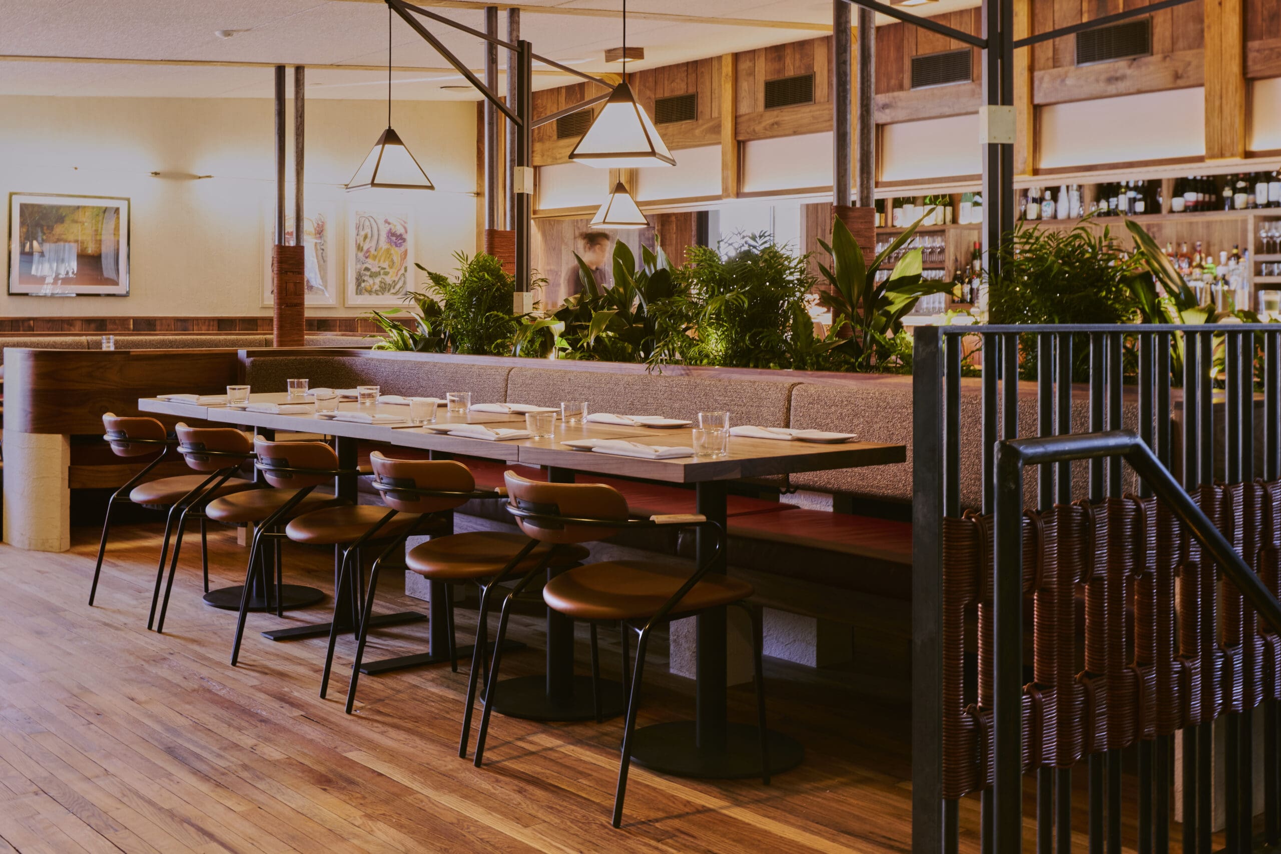 Inside, the restaurant emphasizes natural materials—rough-cut stone, warm wood, and Colorado-made leather details give the space a grounded, tactile feel that complements the vibrancy of the open kitchen. The design team also prioritized honoring Ginny Williams’ legacy, celebrating her contributions as a pioneering gallerist, art collector, and philanthropist who championed underrepresented female and local artists. By studying her collection and incorporating local artwork that echoes its spirit and diversity, the space maintains a tangible connection to Denver’s art history.